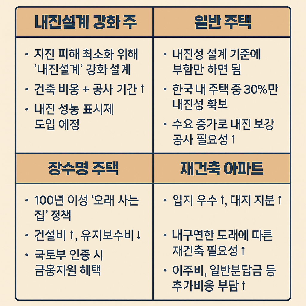 안녕하세요~ 안전하고 오래가는 집, 그리고 정부 지원금까지 꼼꼼히 챙기는 블로거입니다😊 오늘은 최근 조회수 급상승 중인 주제! 내진설계 강화 주택 vs 일반 주택, 장수명 주택 vs 재건축 아파트에 대해 핵심만 쏙쏙 정리해드릴게요.💥 내진설계 강화 주택 vs 일반 주택, 뭐가 다른가요?내진설계란?지진 시 건물이 붕괴되거나 주요 구조물이 파손되지 않도록 설계 단계에서부터 지진하중을 고려해 설계하는 방식이에요.2025년 기준 내진설계 의무 기준2층 이상 & 200㎡ 이상 건물부터 적용6층 이상 공동주택은 고강도 내진설계 필수✅ 내진설계 주택의 장점지진·여진에도 건물 붕괴 방지건물 수명 증가 → 자산가치 유지지진 다발지역(경북, 포항, 울산 등) 주택 선택 시 우선 고려 요소❌ 일반 주택의 리스크1988년..